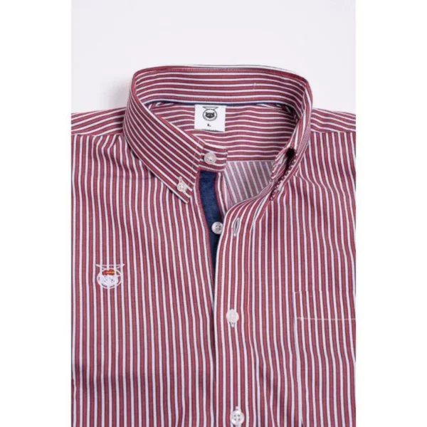 Camisa hombre rayas rubís con bolsillo y carcasa en azul marino. Fabricada con fibras naturales de algodón 100%, cuello abotonado, fibras naturales